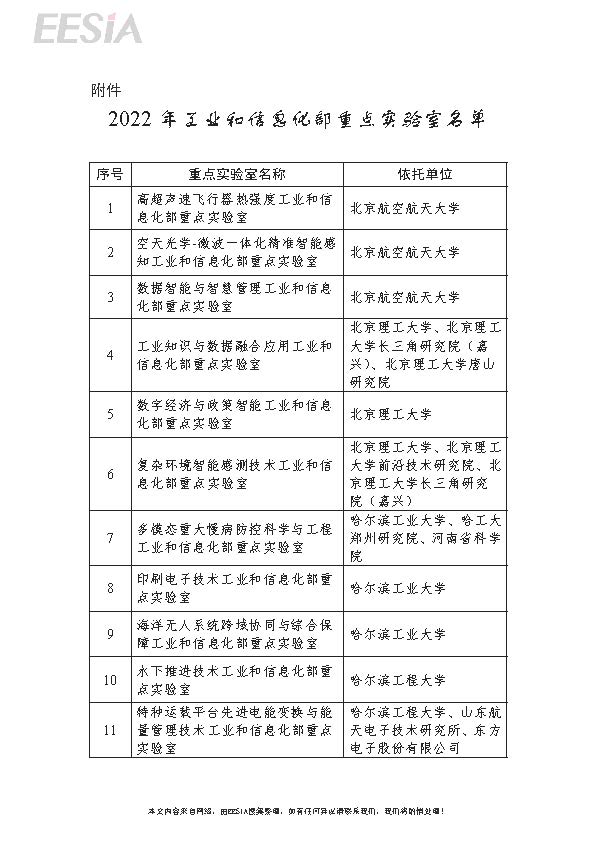 依据《工业和信息化部重点实验室管理暂行办法》(工信部科〔2014〕515号),经评审和公示,现将2022年工业和信息化部重点实验室名单予以公布(名单见附件)。