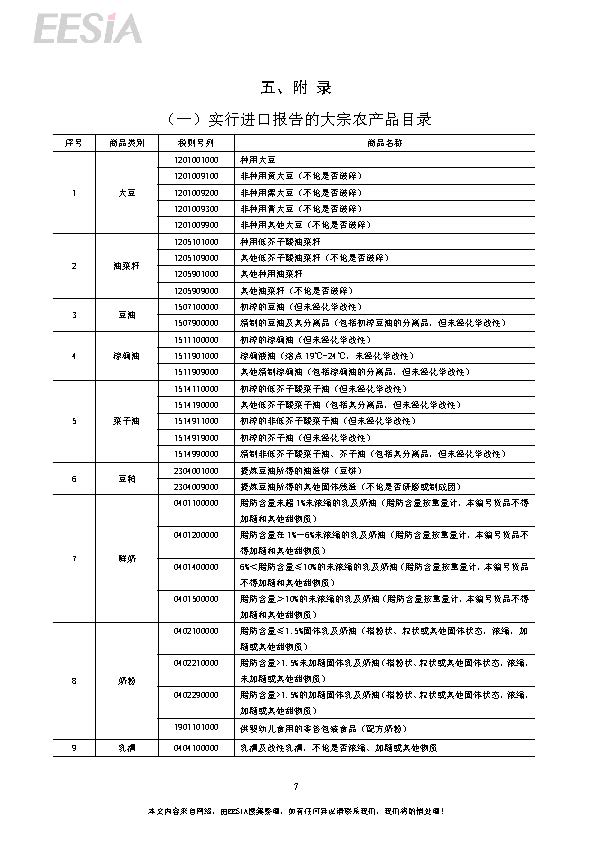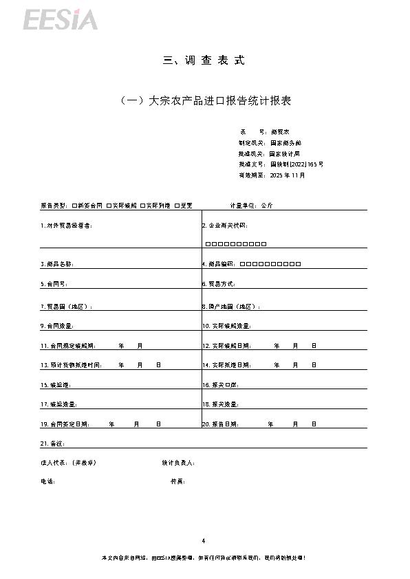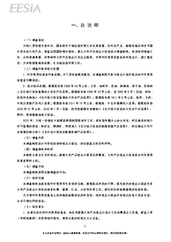 根据国家统计局令2017年第22号(《部门统计调查项目管理办法》)规定,商务部结合近年来我国大宗产品进出口情况和管理需要,对2021年制定的《大宗农产品进口报告统计调查制度》进行了修订,并更名为《大宗产品进出口报告统计调查制度》,经国家统计局批准执行(国统制〔2022〕165号)。在大豆、油菜籽、豆油、棕榈油、菜子油、豆粕、鲜奶、奶粉、乳清、猪肉及副产品、牛肉及副产品、羊肉及副产品、玉米酒糟、关税配额外食糖等14种产品继续实行现行进口报告制度的基础上,主要新增内容如下: