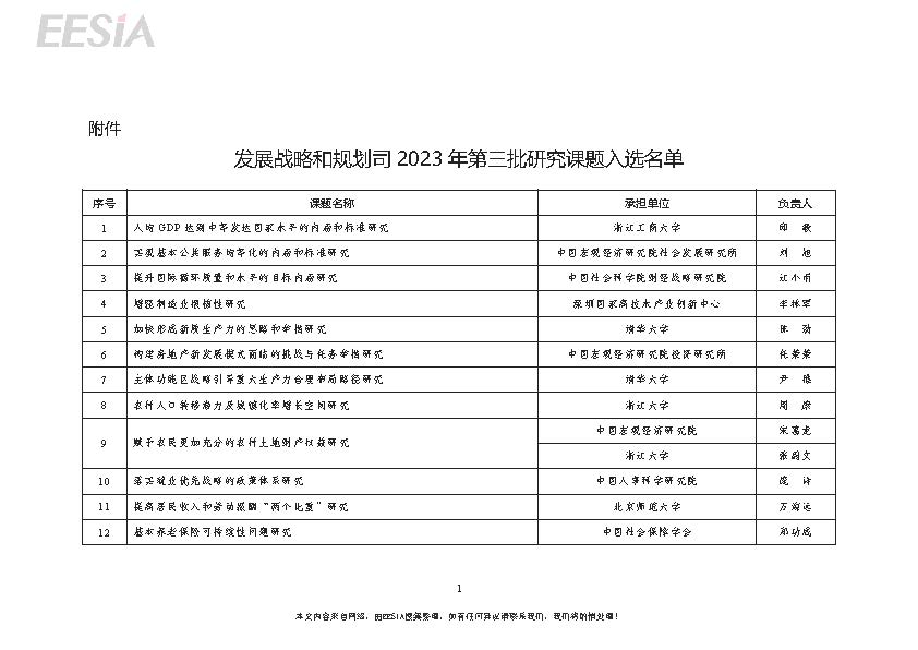 国家发展改革委发展战略和规划司2023年第三批研究课题入选公告