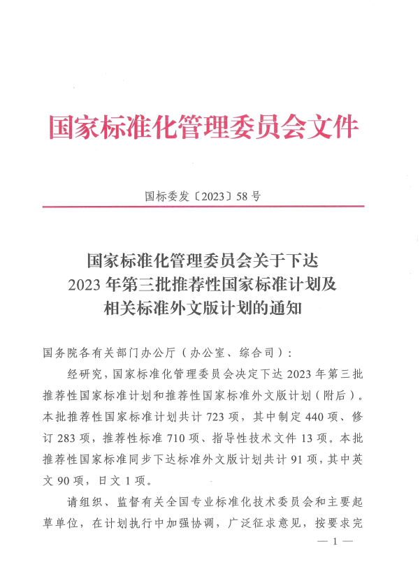 国家标准化管理委员会关于下达2023年第三批推荐性国家标准计划及相关标准外文版计划的通知