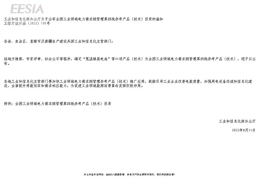 经地方推荐、专家评审、社会公示等程序,确定“宽温镍氢电池”等41项产品(技术)为全国工业领域电力需求侧管理第四批参考产品(技术),现予以公布。