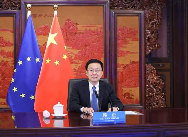 韩正指出,中欧应当充分利用高层对话平台,进一步落实双方领导人共识,推动中欧绿色合作不断深化,为全球可持续发展作出贡献。要强化机制引领,增进理解互信,加强政策沟通协调,聚焦重点领域深化务实合作,力争取得更多丰硕成果。要践行多边主义,助力落实《巴黎协定》,为全球气候合作注入信心。中方愿与各方加强协调、弥合分歧、促进共识,推动《联合国气候变化框架公约》第二十六次缔约方大会取得积极成果。作为《生物多样性公约》第十五次缔约方大会东道国,中方期待与各缔约方共同努力,推动大会取得成功。