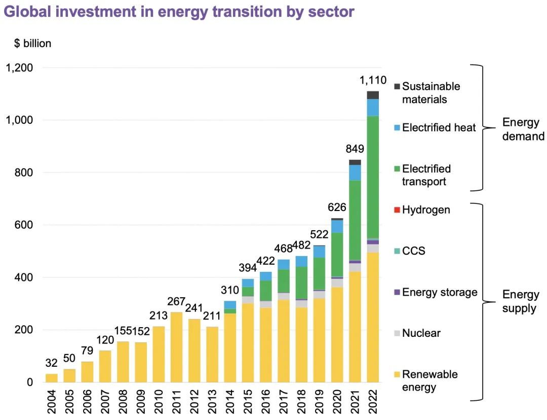 这份《能源转型投资趋势》报告涵盖的所有行业几乎都在2022年实现了创纪录的投资水平,包括可再生能源、储能、电气化运输、电气化供暖、碳捕集与封存(CCS)、氢能和可持续材料。只有核电投资基本持平,未创下新纪录。可再生能源板块仍是最大的投资领域,承诺投资金额达到4950亿美元的最新纪录,同比增长17%。包括电动汽车及相关基础设施在内的电气化运输投资增速更快,达到4660亿美元。