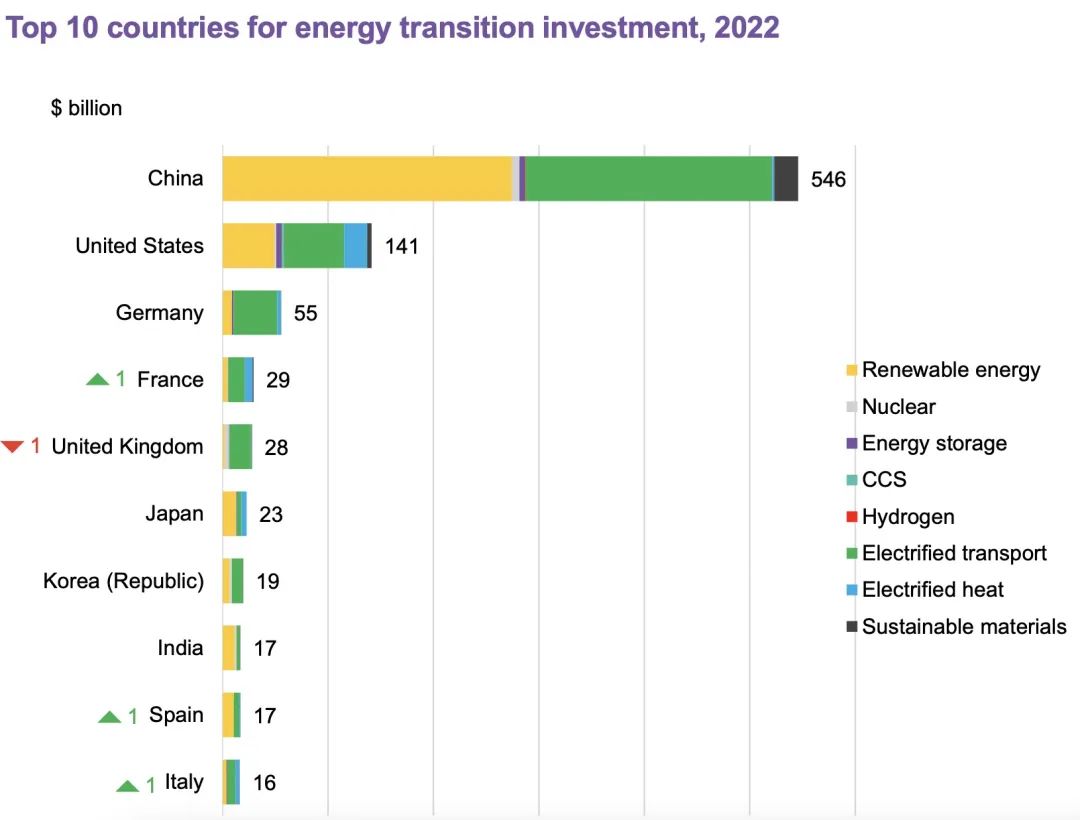 分区域看,中国在全球范围内吸引到的能源转型投资最多,高达5460亿美元,占全球投资总额的近一半。随着可再生能源和电动汽车行业的发展,中国在该领域对美国和其他国家的领先优势有所扩大。美国虽位列第二,但1410亿美元的金额远落后于中国。欧盟如果被视为一个整体,则会以1800亿美元位列第二。德国继续位列第三,英国降至第五,而法国升至第四。